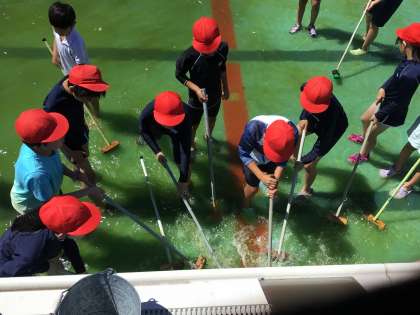 6年生は、汚れをブラシで擦ったり、排水が早まるようにバケツリレーをして水をかき出したりして、どの子も懸命になって取り組みました。そのおかげで、終了予定時刻には、すっかりきれいになりました。保護者の皆様にも準備等ご協力いただき、ありがとうございました。おかげで無事にプール開きができそうです。