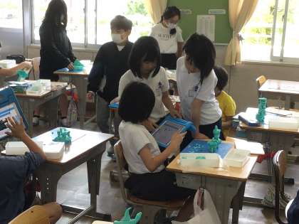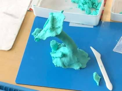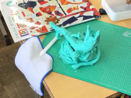 4年生の図画工作科の授業では、粘土を使って立ち上がる作品を作りました。家の中まで工夫した作品、海から顔を出したサメ、木の上に登っているカナヘビなど、個性あふれる作品ができました。鑑賞タイムでは、「サメの顔がリアルなところや、海から勢いよく飛び出した様子がよく表現できてすごかった」「ヘビが上へ上へ上がっていく様子がすごかった。どうやって粘土を上に積み上げたのか疑問に思った」など、感想や疑問をもっていました。鑑賞タイム後は、気付いたことを自分の作品に生かしていきました。