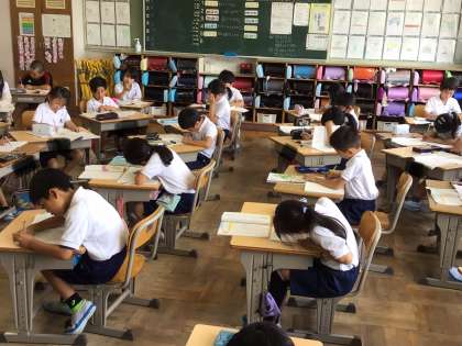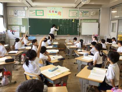 2年生の国語科「名前を見てちょうだい」の学習では、第4場面の登場人物の読み取りをしていました。まず自分で考え、それを班の中で伝え合い、最後に全体の前で発表しました。班や学級の仲間に意見を聞くと、1人では思いつかなかった意見が出てくることに子どもたちは驚いていました。また、「みんなで意見を出すのは楽しかったよ」と、みんなで学ぶことの楽しさを感じている子もいました。