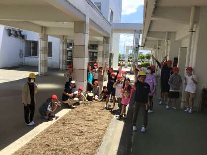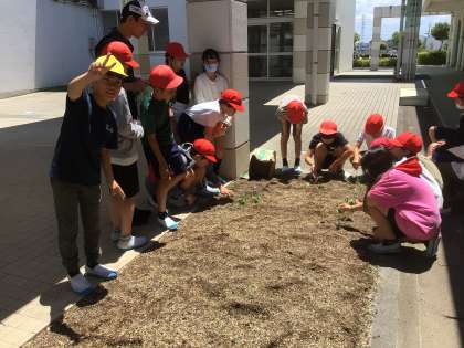 5年生の理科「植物の成長の条件」の学習では、肥料や日光の有無など、条件を変えてインゲンマメを育てています。今日は、条件によって成長がどのように違うのか、畑に観察に行きました。子どもたちに負けないくらい元気なインゲンマメは、どんな条件で育っているのでしょうか。教室に戻ると、それぞれが見つけてきたことをみんなで整理して、インゲンマメが生き生きと育つ条件を見つけることができました。