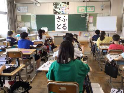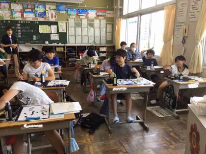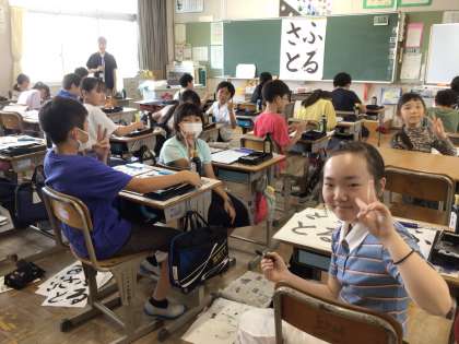 5年生の書写の授業では、「ふるさと」という字を練習していました。丸みのあるひらがなは、毛筆では難しく、子どもたちは苦戦していました。それでも、書けば書くほど上手になること実感できた子どもたちは、「書き初め大会で入賞したことがないから、がんばるんだ!」と言いながら、集中して書いていました。色々な字を書いて、上手になってほしいです。