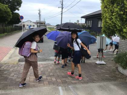 ミニ通学団会では、傘さし登下校のときの安全な歩き方などのお話がありました。熱中症対策としてみんなの命を守るために傘をさしていますが、傘の扱い方によってはかえって危険になってしまうこともあります。今日通学団で聞いたお話を忘れず、安全に登下校ができるようにしていきましょう。