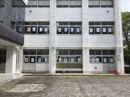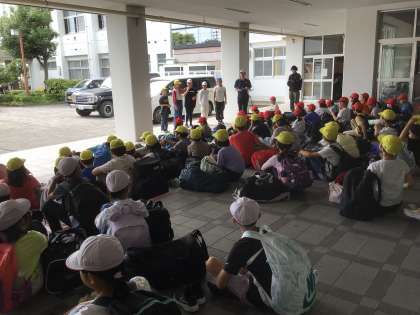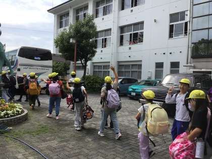 北舎の窓に飾られた6年生からのメッセージや、「いってらっしゃい!」と窓から声をかけてくれた3年生に気づくと、5年生の子どもたちは、学校中のみんなに応援されていることを実感したようです。出発式も真剣に取り組むことができました。