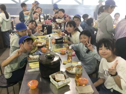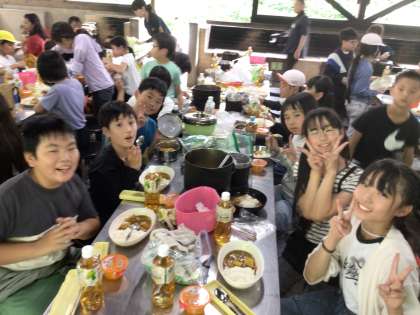 カレーが出来上がり、みんなで美味しくいただきました。同じ材料なのに、出来上がりが違うのはやっぱり水の量のようです。でも、「自分たちで作ったカレーが一番美味い!」とどの子ももりもり食べていました。