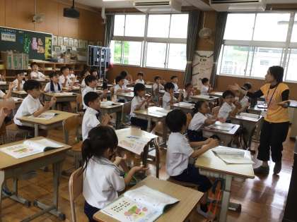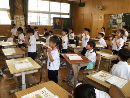 1年生が「かたつむり」の曲に合わせてリズム打ちの練習をしていました。
