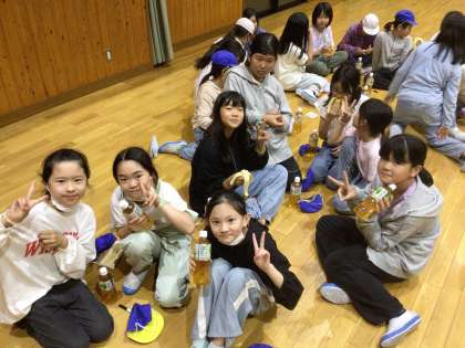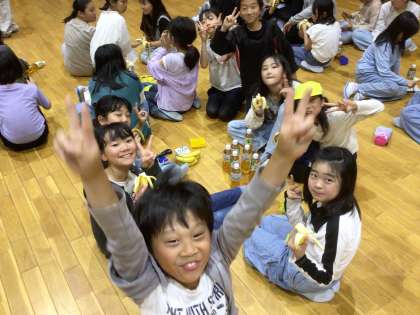 キャンプファイヤーが終わり、野外センターに戻ってきました。夜食のバナナを食べたり、お風呂に入ったり、就寝準備も始まりました。みんな元気です。