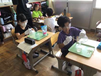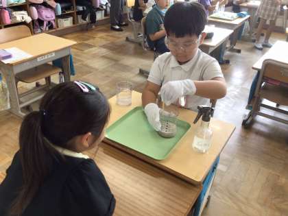 2年生の生活科で、夏野菜を育てています。今日は、「害虫が来なくするための実験をしよう」をテーマに学習をしていました。各自で倒したい害虫を決め、調べてきた「害虫をやっつける方法」を実際に実験してみることで、その有効性を確かめていました。教室に、バジルの香りが漂うと「パスタの匂いがするね」と可愛らしい感想が聞かれましたが、実際に実験が始まると、みんなの目の色が変わり、本当に効果があるのか真剣に確かめていました。中には、実験の前に、お目当ての害虫を捕まえることに苦労しているグループもありましたが、どの子も満足のいく実験ができたようです。これから、この結果をもとに、自分の野菜がさらにおいしくなるように取り組んでいきます。