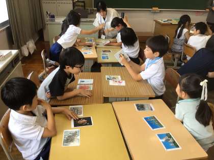 2年生で図画工作科の研究授業がありました。アートカードを活用して対話的に鑑賞会を行いました。アートカードを見ながら、「美人な人が立っている」「卵のようなものが見える」など、それぞれに感じたことを発表しました。先生が、「どこからそう思ったのかな?」と問いかけると、根拠をしっかり話せる子もいました。