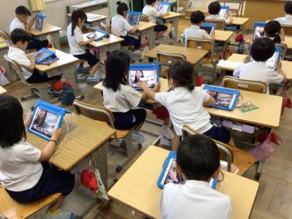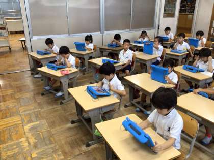 今年の夏休みは出校日がありません。代わりに「オンライン朝の会」を行います。今日は1年生が、その参加の仕方を練習するために、朝の会をオンラインで行いました。画面越しに行った健康観察にも、「はい元気です」と、大きな声で答えることができるなど、担任の先生が教室にいなくても、みんなで協力し合ってオンライン朝の会を成功させることができました。
