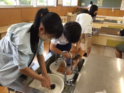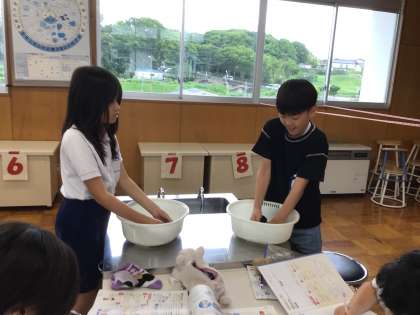 今回は、くつ下の手洗いに挑戦しました。手洗いで洗濯をするのは初めてという子がたくさんいましたが、どの子もしっかりと洗うことができました。スポーツの後やくつ下が泥だらけになったときなど、手洗いで下洗いをしておくことで、汚れの落ち方が大きく違ってきます。衣服を大切に気持ちよく着るために、ぜひ今後の生活の中で実践していってほしいです。