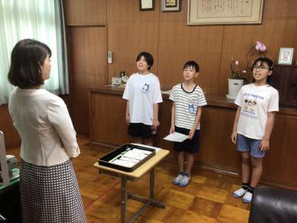 その後の校長先生のお話では、「あいうえおのカギ」の中の、「うのカギ(打ち込むこと)」について、水泳の池江璃花子選手の取組を例にお話がありました。池江選手は、6年前18歳のときに大病にかかりましたが、諦めずに練習に取り組み、日本代表に返り咲きました。そこまで頑張れたのは、「泳ぐことが好き」という気持ちであって、その思いが自分自身を支えたそうです。好きなことにとことん打ち込む素敵な夏休みにしてください。