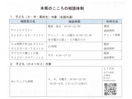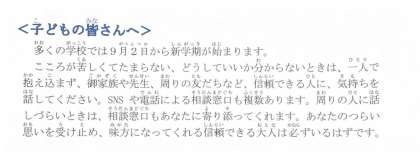 でも、もし何か心配なことがあったら、先生でもお家の方でも友達でも、だれでもよいので、話しやすい人に話してください。もし大人に話してくれたら、早く解決方法が見つかるかもしれませんよ。とにかく一人でなやむ必要はありませんよ。