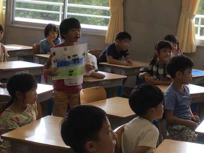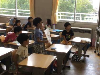 1年生は図工の授業で夏休みの思い出を絵に描き、発表しました。