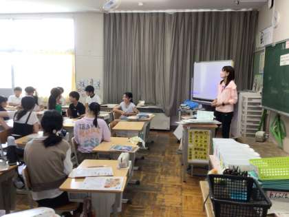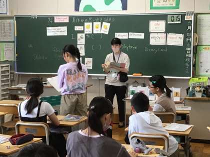 6年生の外国語の授業では、夏休みの思い出を英語で書いたり話したりしていました。全員がワークシートに夏休みの思い出を英語で記入し、その後、発表をしました。