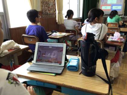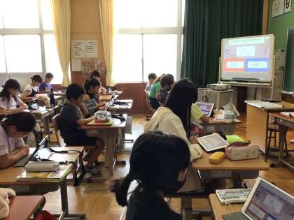 三角形・四角形の角の学習をしていました。まずは復習として、三角形の内角の和の問題に取り組んでいました。学習用タブレット上に出題された三角形の中の1つの角度を、暗算で素早く求めるためにみんな集中していました。
