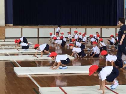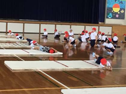 マットでいろいろな動きを学ぶことで、普段は使わない体のいろいろな筋肉を動かすことができました。マットでとびはねたり転がったりした子どもたちはみんなにこにこの笑顔で体を動かすことを楽しんでいました。