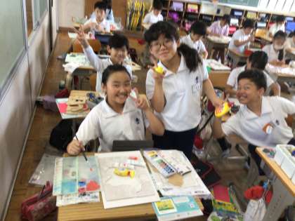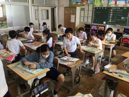 5年生は、図画工作科の授業で、「切り分けた形で◯◯を造る」学習を行いました。「ビー玉を転がすコースを作りました。このゲームは意外に難しいです」「野菜をテーマに、レタスやゴボウなどを作りました。本物に似ている色にするのが難しかったです」「スパッタリングで模様を付けるのが楽しかった」などの感想をもちました。