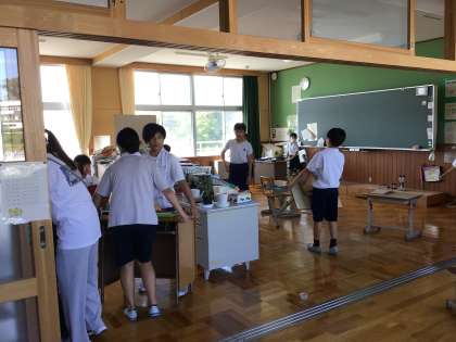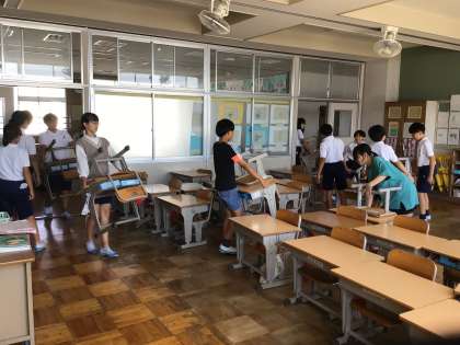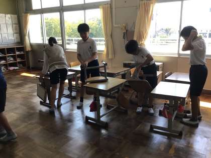 昨日は教室を中心に行ったので、今朝子どもたちが登校すると、教室の床はピカピカになっていましたが、机など何もない状態でした。そこで、活躍してくれたのが6年生です。登校するとすぐに下級生の教室に行き、机やロッカーなどを次々と運び入れてくれました。おかげで、朝の会を時間通りに始めることができました。さすが高学年だな、と感心させられました。