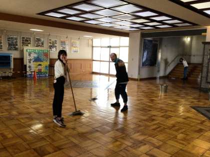 下校後、先生達は、みんなで廊下や階段のワックスがけを行いました。