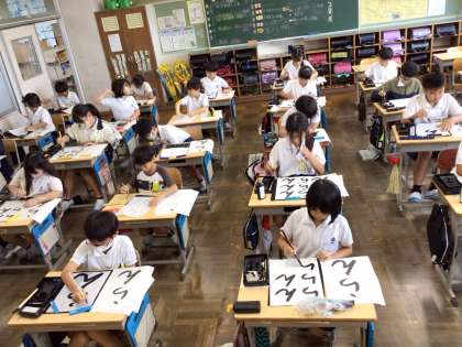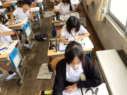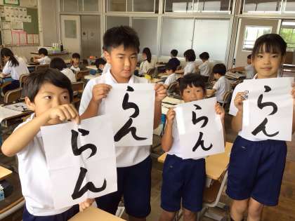 4年生の書写では、ひらがなの「折れ」の部分に気をつけて書く練習をしました。今日、初めて筆で「らん」を書きました。折れの部分で一度筆を止めて、上手に書きました。