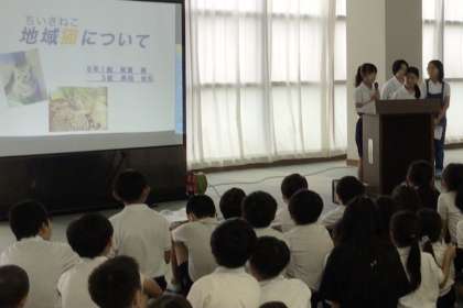 今日の「わらべちゃん」は、保護猫活動に取り組んでいる6年生2人が、保護猫活動とは何か、なぜ保護猫活動が大切なのか、などについて発表しました。全校にとったアンケートの結果などをパワーポイントにまとめ、低学年の子にも分かりやすく説明しました。発表の途中には、保護猫活動をしている地域の方の飛び入り参加もありました。発表後には、「保護猫活動ということを初めて知りました。童子山小学区から野良猫が減るといいなと思います」「地域のために取り組んでいることは、本当にすばらしいと思いました。私も何か地域のために行動したいと感じました」などの感想がありました。