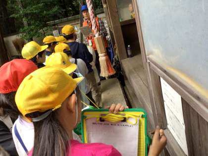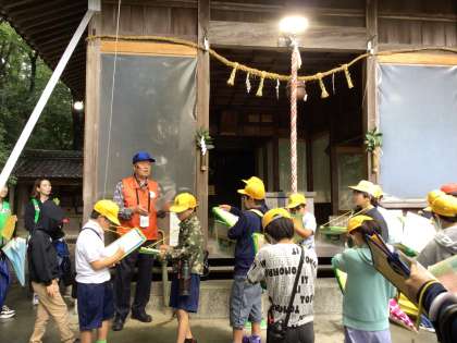 樹木神社では、この神社は矢作川が氾濫したときにお城と一緒に移転してきたこと、祀られている神様が6人いることを教えてもらいました。雨の中、丁寧に教えてくれる地域の方のお話を、熱心にメモしていました。