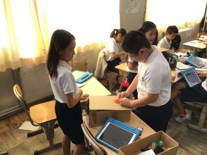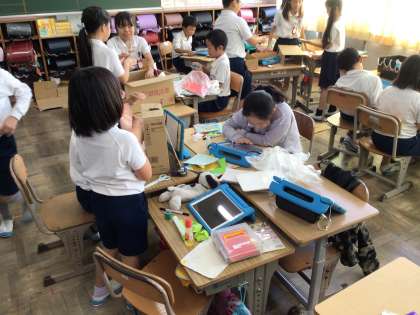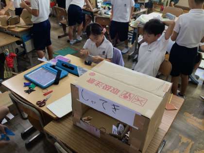 3年生は、高齢者の方との交流に向けて、射的、玉入れ、ビンゴボールの製作に取り組みました。「もう少し大きくした方が握りやすいよ」「玉がいっぱい入った方が喜んでもらえると思うから、もっと玉が入りやすいようにしよう」「当たりが出た時に、音とかで示せると、おじいさん、おばあさんには分かりやすいと思う」などと友達と相談しながら、相手意識をもって製作しました。