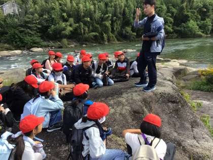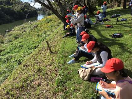 現地に到着すると、「思っていたより、急に曲がっているね」「流れが速いところと遅いところがあるよ」など、実際に見ないと気づかないことをたくさん見つけることができました。そして、学習用タブレットで写真をとったり、メモをとったりしていました。今日見つけた気付きや疑問から、学習を深めていきます。
