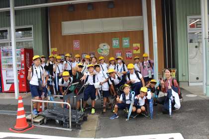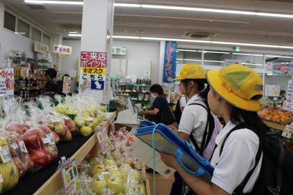 5年生が、総合的な学習の時間「地産地消大調査」の一環で、JA産直広場の見学に出かけました。たくさん並んでいる野菜や果物の産地を調べ、「50種類の野菜の産地を調べたよ」「同じ野菜でも愛知県産のものと、豊田市産のものがあるね」など気付いたことをどんどんノートに書きました。お米の売り場では、豊田市産のお米がたくさんあることに驚いている子がいました。JA産直広場の方に、「国内の物しかないのですが、海外からの品は仕入れてないのですか」と社会科での学習と繋げて質問した子がいました。産地が違うと値段が違うと気付いた子もいました。「もっと見学時間がほしい」という声があり、今後さらに追究をしていってほしいです。