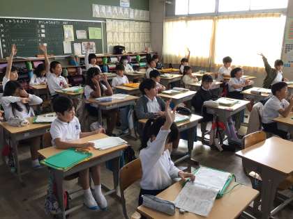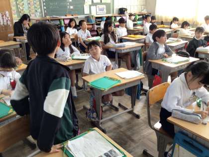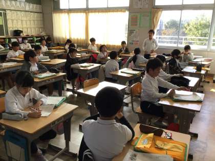 3年生は、社会科の授業で自分が追究している古い道具を発表しました。「僕は、バネばかりを追究しています。これは重さを計るものです」「これは、鰹節削りです。鰹節を作るときに使います」「この使い方は、蓋を開けて、歯みたいなものがついていて、それで削ります」「まるで、黒板クリーナーのような使い方をします」などと、対話が行われました。
