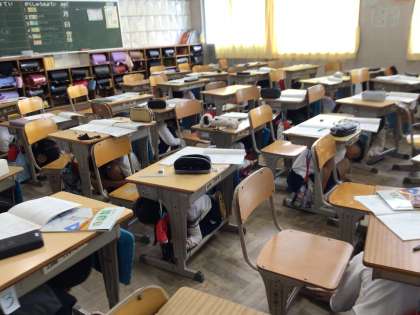 運動場にある防災行政無線のスピーカーから、緊急地震速報があったときの訓練放送が流れました。放送の内容を聞き、素早く机の下に避難したわらべっ子です。自分の身は自分で守る。正しい情報をキャッチして行動に移せるように、日頃から気をつけているから、すぐ行動にうつすことができました。いつ起こるか分からない災害に備えておきたいですね。