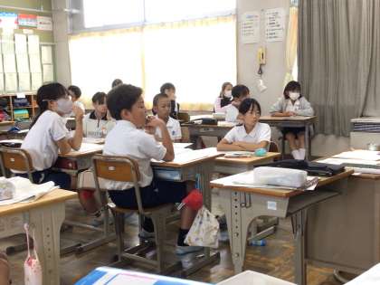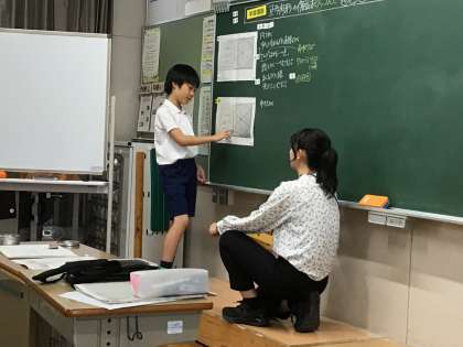 5年生は、正多角形の作図の方法について学びました。前の授業までに学んだ正多角形の定義や特徴を活用しながら作図の方法を説明しました。発表を聞く中で、説明に対して、様々な質問があり、発表した子が答えていました。このように、他の子の解説を聞いたり質問したりすることで正多角形を作図するのには様々な方法があることを学びました。子ども同士で話し合い、学び合うことを通して、理解が深まりました。授業後の感想には、「私が知らなかった作図方法を知ることができて面白かった」「みんなで質問しながら作図方法を考えたから、とても分かりやすかった」などの感想がありました。