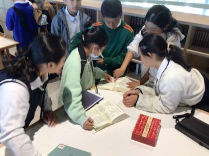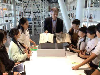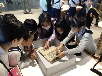 5年生は、校外学習で博物館に出かけて昔の貴重な資料を見せていただきました。博物館のご厚意で、見るだけではなく、実際に手に取らせていただきました。平安時代の古今和歌集と礼記を手に取った子どもたちは、「藤原とか読める字がある」「昔の人の字は美しい」などの感想をもちました。博物館の講師から「これは版画で書かれたものだから、何冊も印刷できるものなのです」と話があると、「昔の人もすごいね」「版画のおかげで昔の本を今の人も読めるんだね」と友達同士で意見交換をしました。とても貴重なものを手に取ることができた子どもたちは、緊張しながらも嬉しそうな表情を浮かべていました。