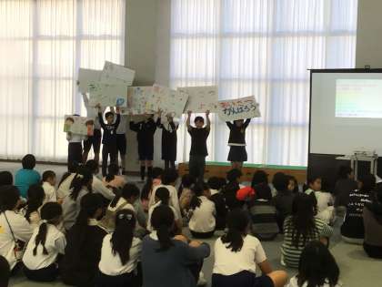 今日は生活委員会がわらべちゃんであいさつについて発表しました。