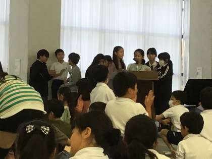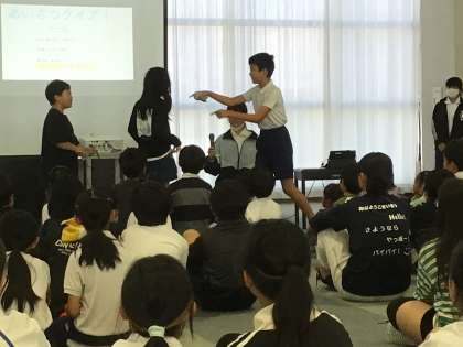 あいさつのよさや大切さについての発表の後に、「あいさつクイズ」がありました。生活委員の名演技に会場はとても盛り上がり、良いあいさつについてみんなで考えることができました。