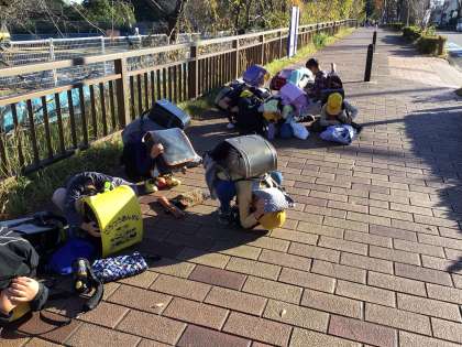 その後、学校から出てしばらく歩いたところで各通学団ごとにシェイクアウト訓練をしました。