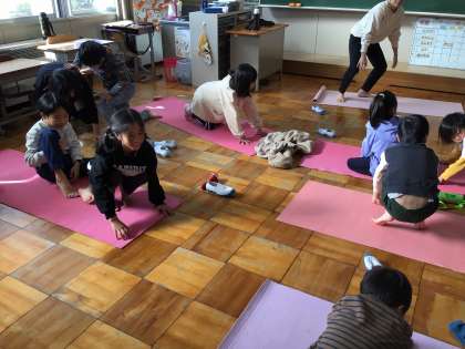 山あす1階の子どもたちは、ヨガの講師をお招きしてヨガに取り組みました。息を吸ったり吐いたりしながら呼吸を整え、体を伸ばしたり縮めたりして体を動かしました。中でも、カエルの格好に挑戦した際には、できた子に対して「すごいね」「手の力が強いんだね」「バランスを取るのが上手ですごい」となど称賛していました。「次は僕もできるようになりたい」と、とても意欲的になっていました。