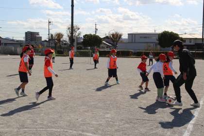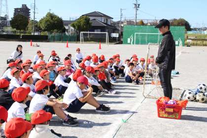 グランパスから来たコーチが専門的な技術を教えてくれるボールクリニック。2年生は1年生よりもレベルアップした内容で、パスやドリブルの練習もゲーム感覚で楽しんで取り組んでいました。