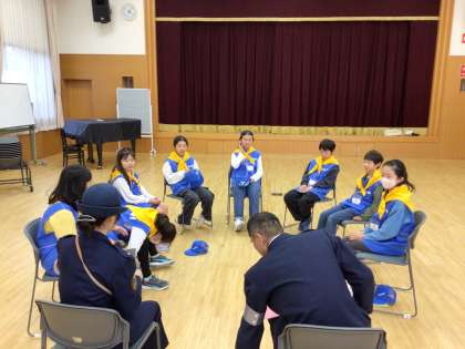 本日、下校後に朝日丘交流館にて、5年生8人で活動している防犯少年団の活動の一環として「連れ去り防止教室」を行いました。まずは、多目的ホールに集まり、不審者の特徴や不審者に出くわした時の対処法などを、豊田警察署の方と話し合いました。「不審者は、あやしい恰好をしている人だけではない」「大きな声で助けを求めながら逃げる」など、様々な意見が出ました。