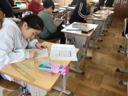 今日は、平均を使って自分の1歩の歩幅を考えていました。どうやって測定したらよいかを考え、10歩あたりの歩数を何度か計測した数字をもとに、友達同士で相談しながら平均を計算していました。「これから道の長さがだいたい測れるからやってみたい」と感想をもった子もおり、生活の中で生かしていけそうな学習でした。