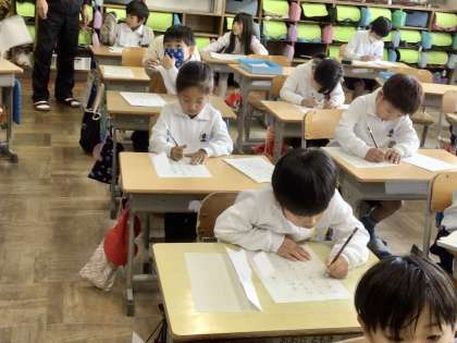 1年生が書き方の授業で書き初めの練習を始めました。先生に、書き初めとは何かや書くときの注意などを聞き、お手本をよく見て、一文字ずつ丁寧に書いていました。集中して取り組んでいたので、一行書き終えると深呼吸をしている子もいました。