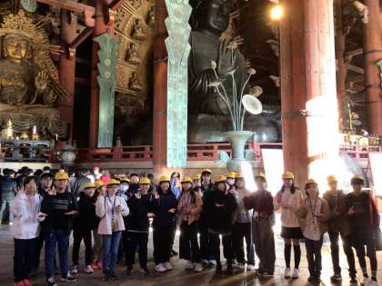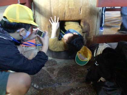 柱の穴をくぐると賢くなると聞いて、大行列ができました。「オールAを目指す!」そうです。