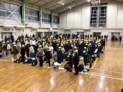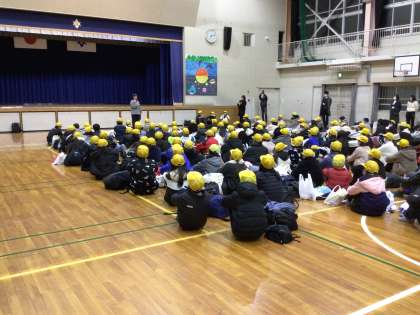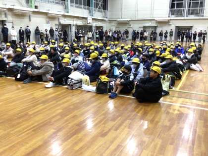 予定より少し遅くなりましたが、無事に学校に到着し体育館で到着式を行いました。