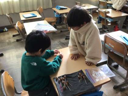 1年生が、学習用タブレットを使ってどんぐりを使ったおもちゃの写真撮影をしていました。秋に集めたどんぐりで、どんぐりのコマや迷路、いろいろな遊びを満喫したので、楽しそうに写真撮影をしていました。