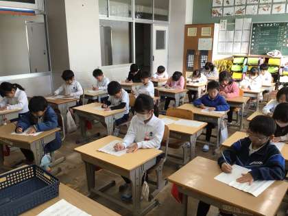 1年生は、初めての書き初めに挑戦中です。綺麗な字を書くためにはよい姿勢が大切だと聞いて、背中をピンと伸ばしてゆっくりと字を書いていました。