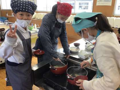 初めて煮干しで出汁をとった子も多く、出汁をとった後の煮干しも喜んで食べている子がたくさんいました。みそ汁は和食の基本、ぜひご家庭でも作って見てください。