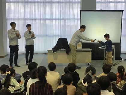 今日の「わらべちゃん」は、トヨタ自動車技術会主催の「こども乗り物デザイン展」で優秀作品に選ばれた3年生の発表でした。3年生の子が考えた「夢の車」をトヨタ自動車の方が、実際に動く模型として作ってくれたのです。完成まで4ヶ月もかかったそうです。表彰の後、作品の実演も行われ、細部まで丁寧に再現された作品に感嘆の声があがりました。来週月曜日まで校内に作品を展示しますので、ぜひ見てください。