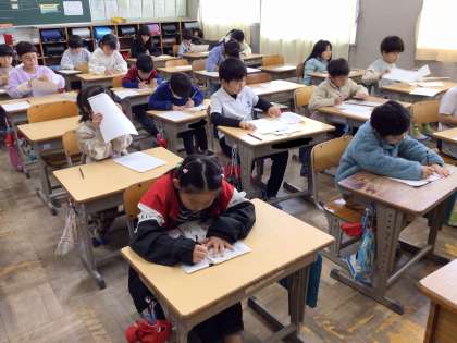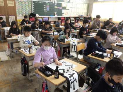 3・4時間目の教室は、しーっんと静まりかえっていて、どの子も黙々と書き初めに取り組んでいました。その表情はきりりと引き締まり、真剣そのものです。