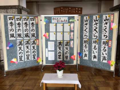 7日(火)に行われた書き初め大会の作品が、各学年のワークスペースに展示されました。どの作品も練習始める前と比べると見違えるほど立派になり、子どもたちの成長に驚かされました。子どもたちも友達の作品を見ながら、来年の目標を決めていました。