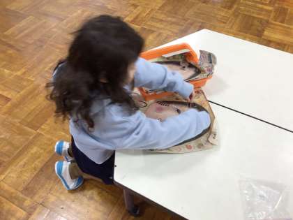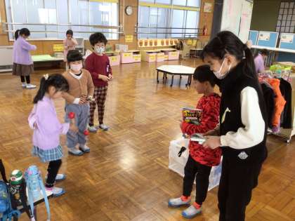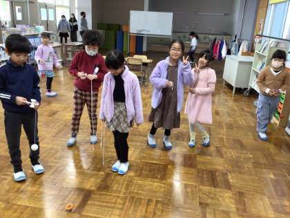1年生は、昔の遊びに夢中です。園の頃からけん玉をやっている子も多く、そのレベルの高さに、通りがかりの4年生や先生たちもびっくり‼️ 駒回しや福笑いも人気のようです。